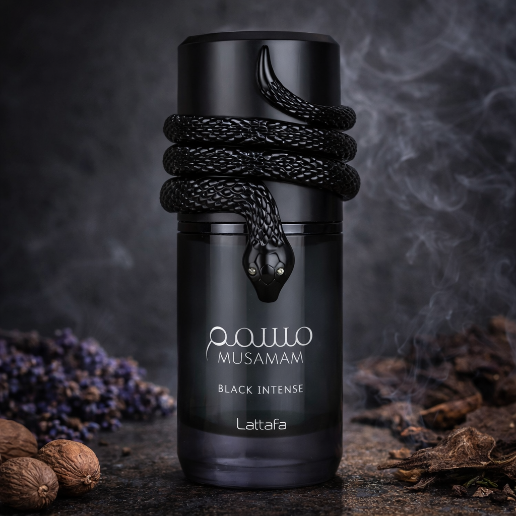 Musamam Black Intense de Lattafa Perfumes est une eau de parfum aromatique boisée distinctive, lancée en 2025 et signée par le parfumeur Jordi Fernández.